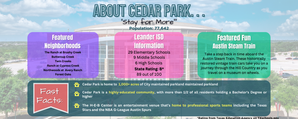 Cedar Park is booming! And no, I'm not just talking about the Friday night fireworks. According to the U.S. Census Bureau the population is 77,642 and counting, Cedar Park has experienced impressive growth in the last decade. But don't fret; this place still...
