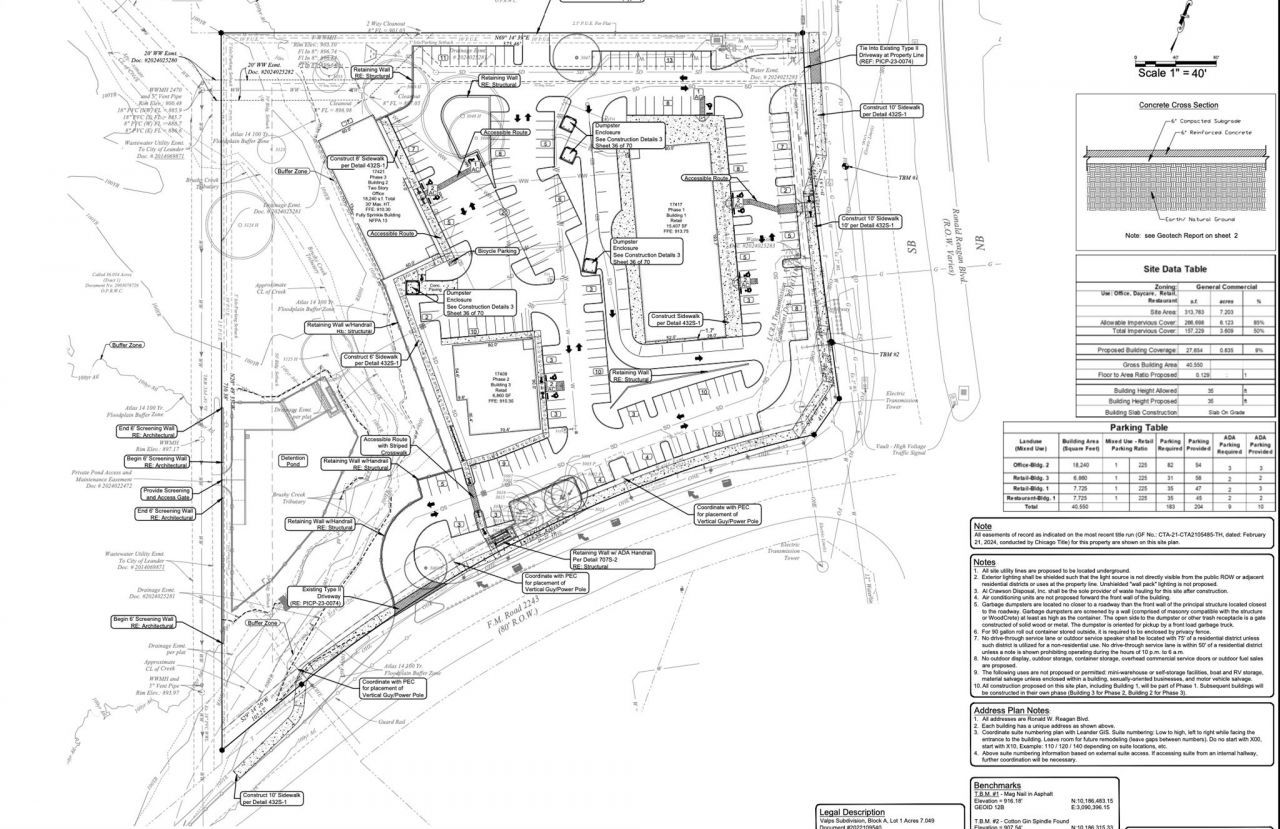 Prime hard corner lot at 2243 & Ronald Reagan in Leander. Over $600k of engineering, planning and permitting work completed. Currently approved for 22,267 SF of retail and 18,240 SF of office, but plan can be changed to fit buyer needs. Zoned General Commercial. Access from both Ronald Reagan and 2243.