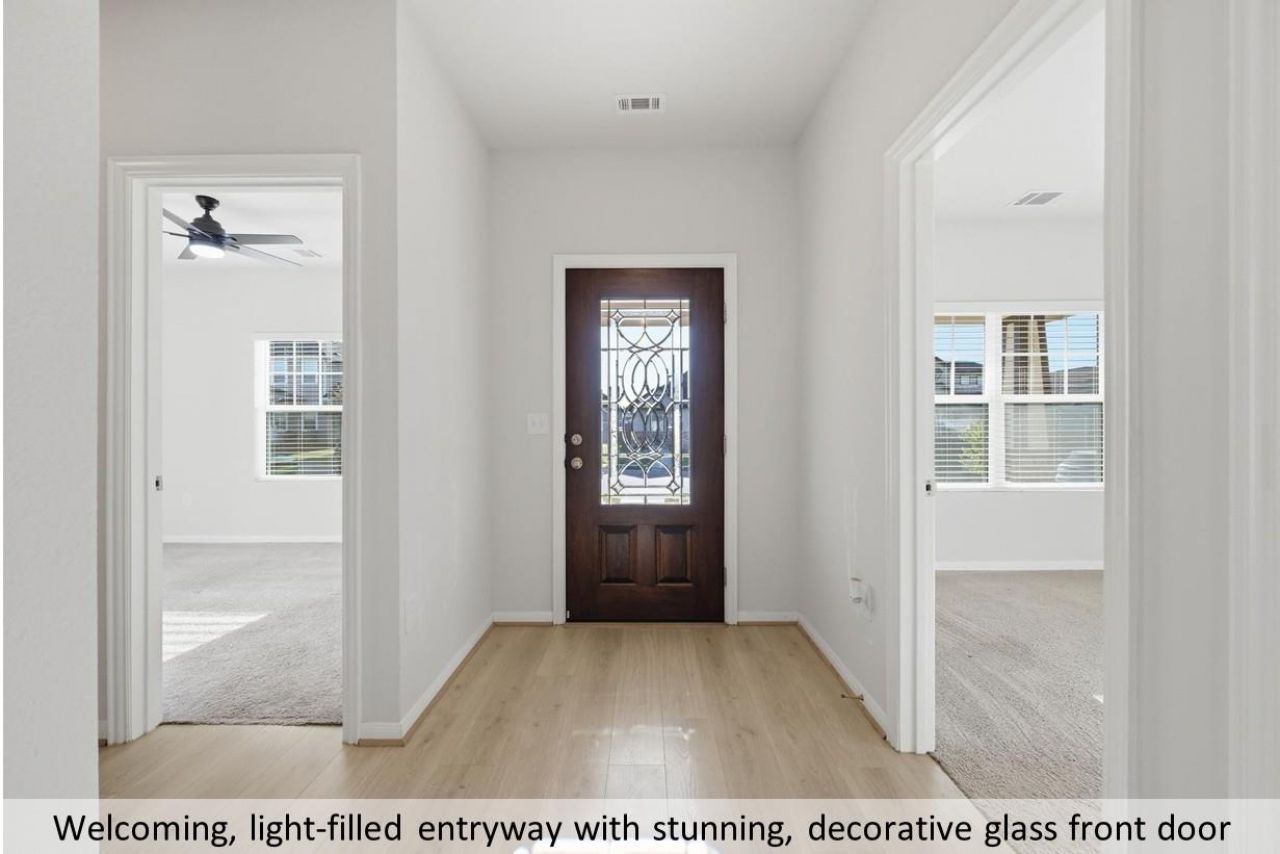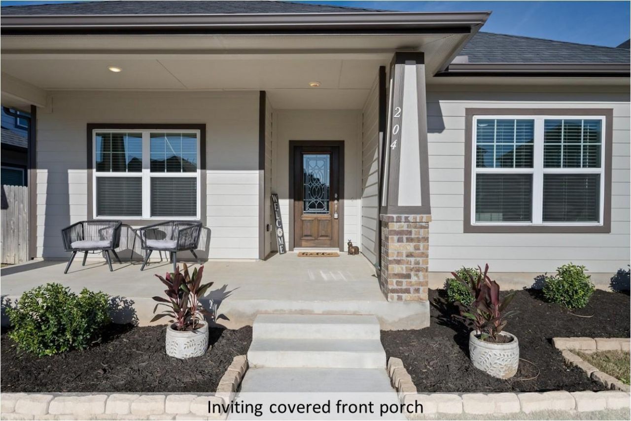 Single-story 2022 build ¢ 4 bedrooms ¢ rear-facing oversized garage. Located in Brooklands with access to Hutto Lake Park, Creekside Park, Historic Downtown Hutto, Starbucks, Texan Cafe, H-E-B, and US-79.Built by CastleRock Communities, this 4-bedroom, 2-bath home offers an open floorplan designed for functional living. The kitchen features a center island with bar-top seating, stainless steel appliances, pantry, and instant hot water.The primary suite includes a double vanity, soaking tub, separate walk-in shower, and large walk-in closet. Three secondary bedrooms provide flexible use, including one with a walk-in closet.Additional features include a large laundry room with space for a refrigerator, washer and dryer that convey, tankless water heater, water softener, and a 100 TV that conveys.Exterior features include covered front and rear porches, fenced yard, and automatic sprinkler system. Rear-facing oversized 2-car garage.Zoned to Hutto ISD: Ray Elementary, Farley Middle, and Hutto High School.