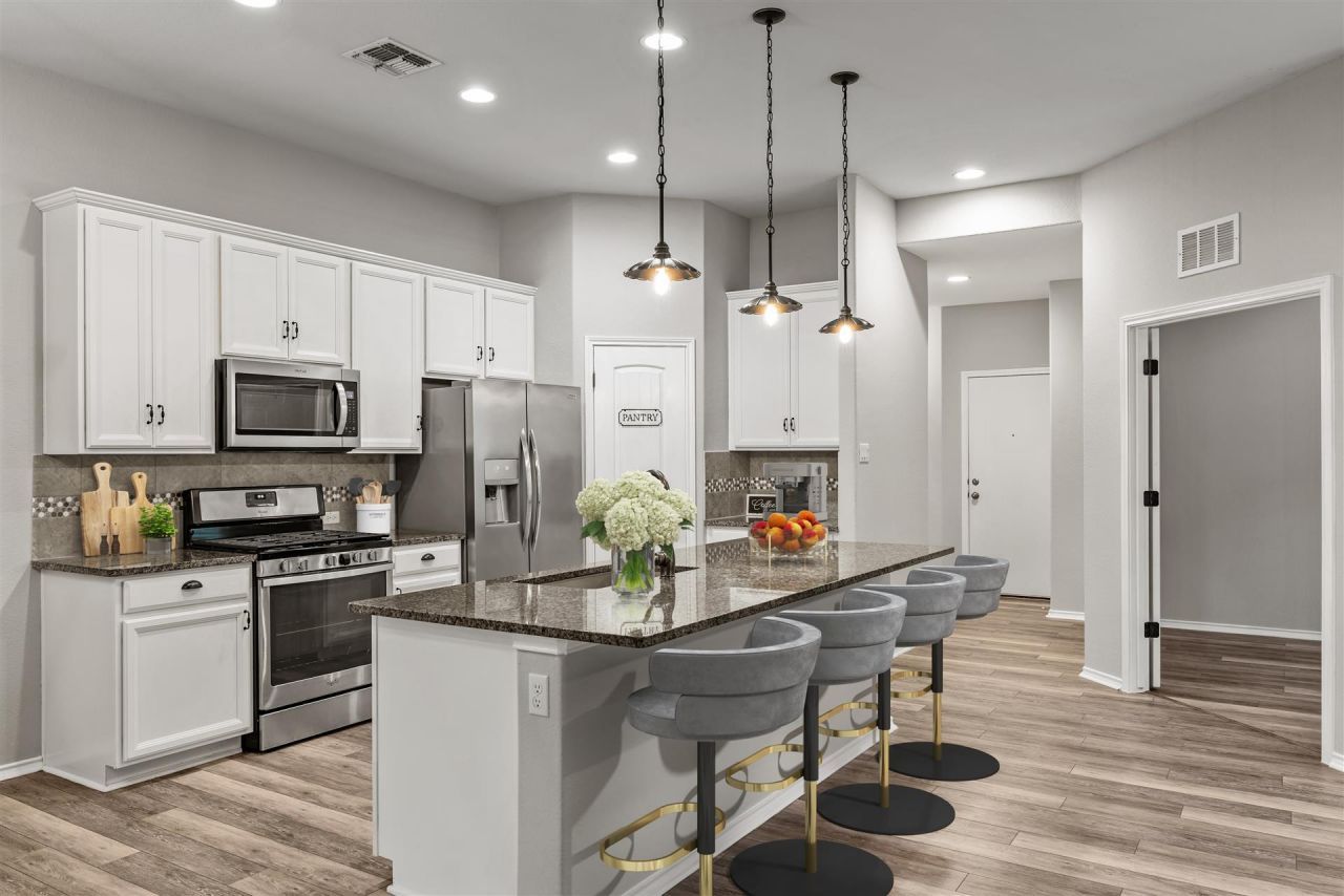 Stunning model like home, all sides brick, open & spacious layout, kitchen features beautiful granite counters, kitchen island overlooks family & dining area, stainless steel appliances, breakfast & formal dining area or could be used as 2nd living area, family room has upgraded wall of wood overlay, upgrade ultra vinyl plank floors, double vanity, separate tub & shower w/seat, office w/ french door entry or use as 4th bedroom, extended 17x12 back covered patio, great location across from family area and pool, walking distance to High School and Elementary, must see this amazing home
