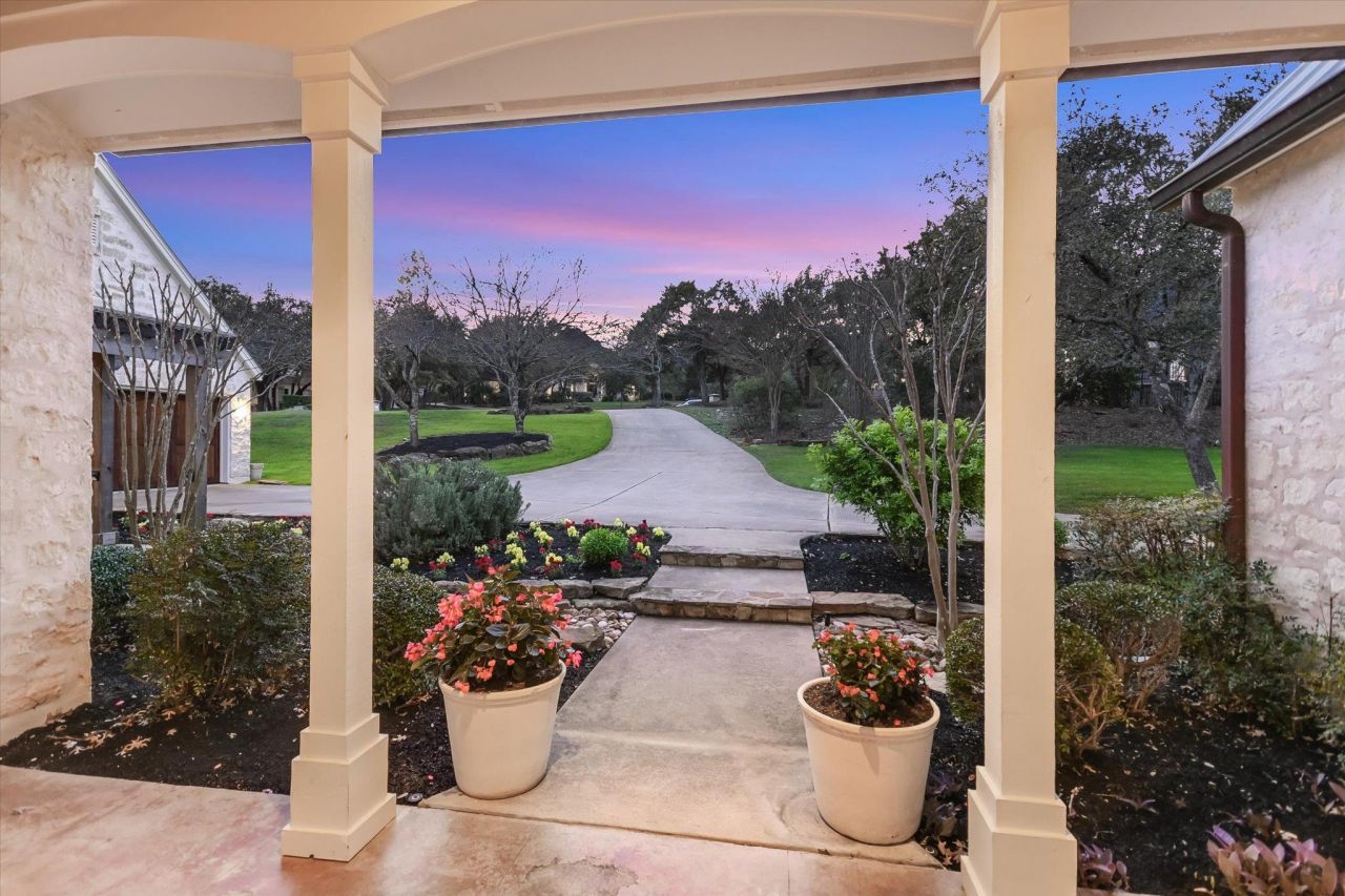 In the Fredericksburg tradition, this white native stone home with the German schmeer finish and standing seam metal roof is a picture-perfect Texas Hill Country single-story set on a private 1 acre cul-de-sac lot. The home was custom built to reflect the Austin lifestyle. The double entry Maple doors open to a sunlit interior with floor-to-ceiling windows in every room to take in the view of the outdoors. The tall ceilings are set off with 12:12 vaults in one living room, the primary suite and two bedrooms. A stone fireplace separates the two living rooms that could also function as a living room and a formal dining room. The delightful cooks kitchen is the heart of the home. It is fully equipped with a 38Lacanche Cluny Range featuring a gas cooktop, a gas oven & electric oven. There are 2 sinks, 2 Bosch dishwashers, Uline Icemaker, outfitted pantry, over 14 feet of countertop workspace, 7 electric outlets & a central island that is over 7 long & 3 wide & includes electrical outlets and storage. This large room could accommodate a generous dining table or serve as comfortable gathering-living room. Solid Maple wood cabinetry with glass front upper cabinets & deep drawers add warmth to this large room. The pull-outs in the lower cabinets make every inch accessible. An atrium door leads to the covered porch and the designated grill area below. The outdoor 42 Hestan Grill is equipped with a rotisserie and two side burners. The utility room is conveniently located adjacent he kitchen and next to the family entrance. It is complete with a sink, additional custom Maple cabinetry. Stained and scored concrete floors extend throughout the home with the exception of solid Cherry floors in the primary bedroom. The ceilings in the primary suite soar above a 12 plate height to a 12:12 vault. The large bath features Cherry cabinetry, jetted tub,large shower & two walk-in closets. The private primary suite has an 8 atrium door to the covered back veranda.